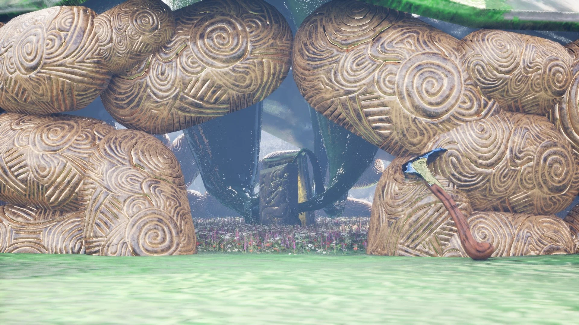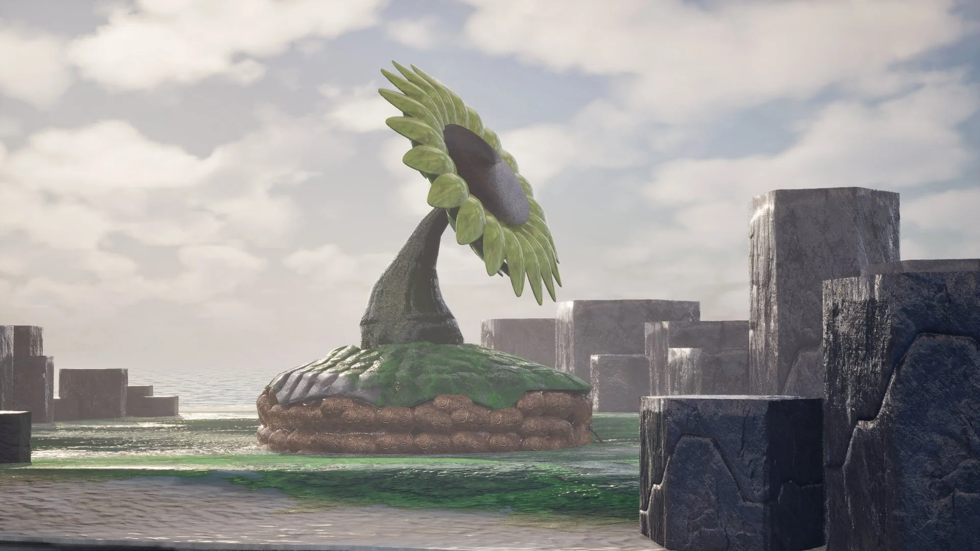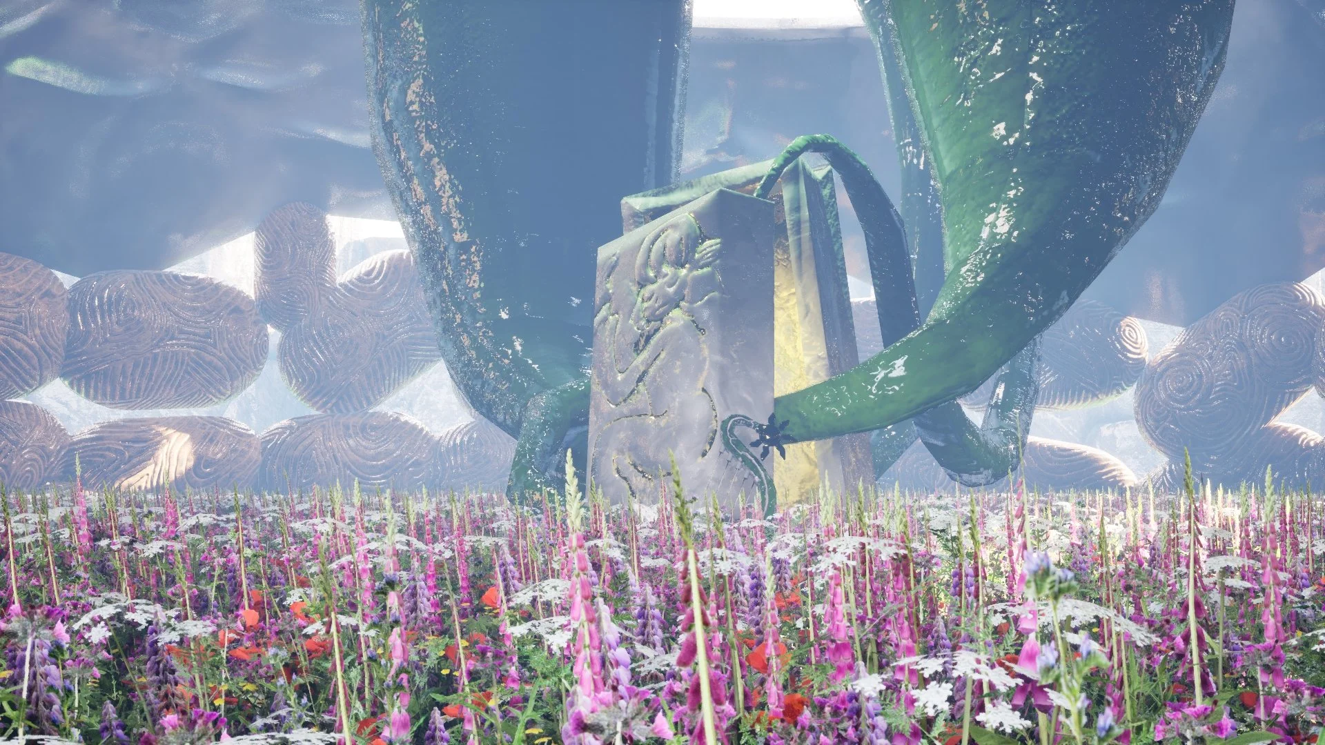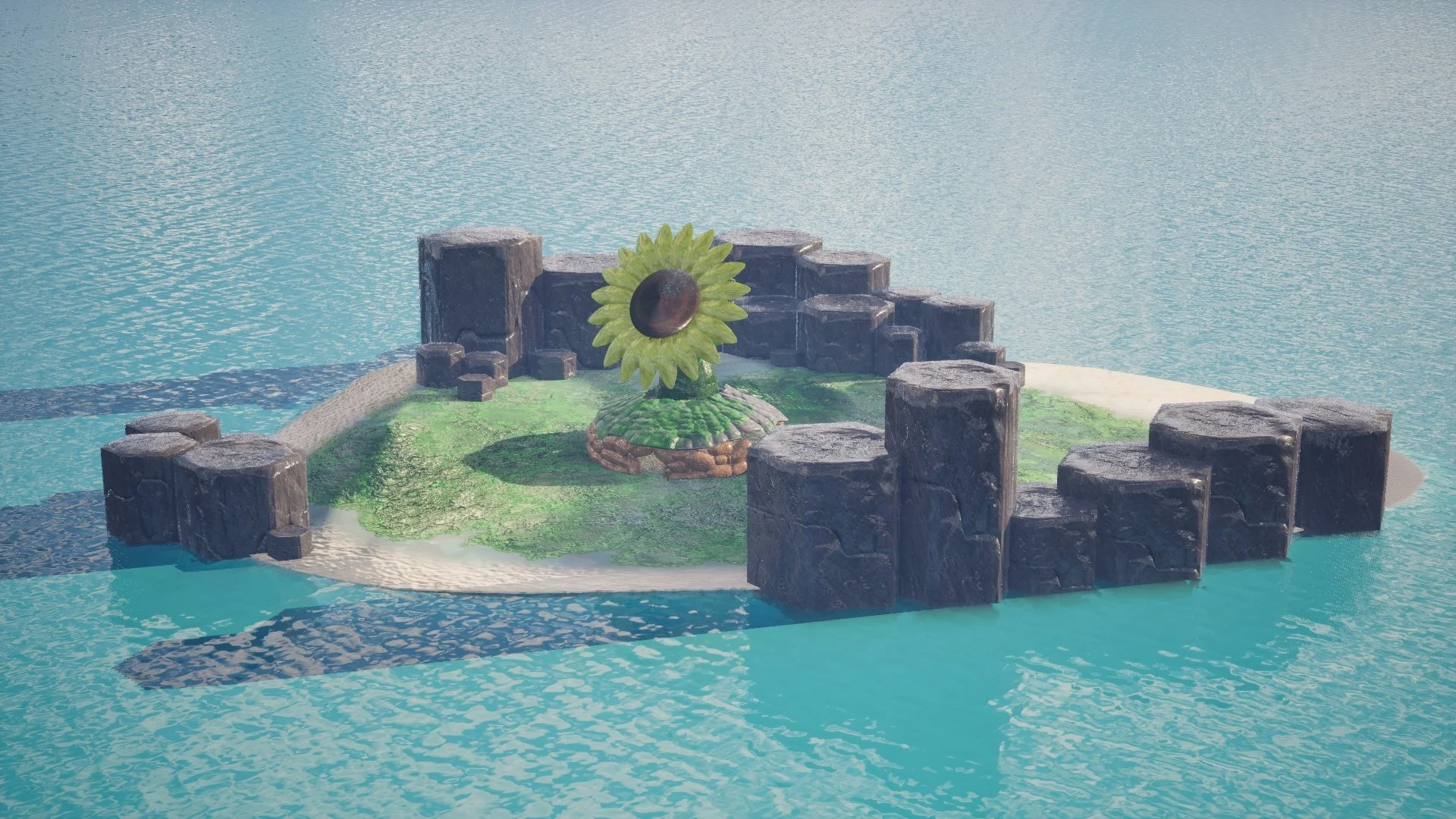 Inspired by the movie “The Green Knight”, Irish burial mounds, and the fantastical allure of fey folklore, I wanted to make a grave dedicated to “The Flower Knight”. The knight was working under a lord in a local village. After seeing how the local fey were being driven out from their forests to use their trees for logging and construction, the Flower Knight swore loyalty to the Royal Fey court. Blessed with long life for his loyalty, he lived well beyond human age. Eventually though, his time came and the fey immortalized him in his own grave on an island where he can rest. On his island is the hammer he would use to protect the fey and the harp he would play in times of leisure. On his coffin is the visage of his fey wife sculpted on the lid.